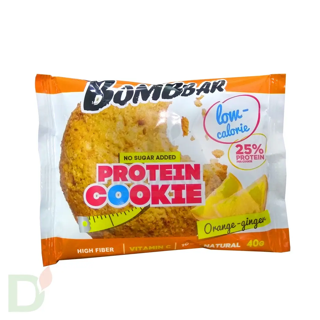 <h2>Вкусный и питательный низкоуглеводный перекус</h2> Если у вас диабет, вероятно, вам даже не придется делать подколку инсулина на это печенье, ведь углеводов на одну печенюшку содержится мизерное количество! В то же время, за счет протеина в составе, печенье очень сытное и питательное - оно прекрасно утолит голод и поможет вам “дотянуть” до следующего приема пищи. Маленькая и компактная упаковка позволяет брать протеиновое печенье с собой и делать перекус там, где вам захочется. Среди большой палитры вкусов вы точно найдете то, что направится именно вам!<br> <h2>Кому подойдут для перекуса протеиновые печенья</h2> Печенье понравится всем: любителям сладкого, соблюдающим диету, диабетикам, спортсменам, беременным и кормящим<br> <br> <b>Печенье Bombbar не содержит ГМО, сахара и лишних углеводов!</b><br> <h2>Пищевая ценность и калорийность одного (40 грамм) печенья</h2> Белки - 10 г, жиры - 3,2 г, углеводы - 5,7 г, пищевые волокна - 5 г<br> Энергетическая ценность - 102 Ккал<br> <h2>Состав протеинового печенья Bombbar</h2> белки молочные (концентрат сывороточного белка, концентрат молочного белка), отруби овсяные (содержат глютен), изомальтоолигосахарид, апельсин, имбирь, вода, эритрит, растительное масло, продукты яичные (меланж яичный), соль, ароматизаторы натуральные, гидрокарбонат натрия (сода пищевая), регулятор кислотности - лимонная кислота, эмульгатор (соевый лецитин), антиокислитель (аскорбиновая кислота), подсластитель - сукралоза, консервант (сорбат калия).<br> <br> <b>Противопоказано при индивидуальной непереносимости белка молока. Может содержать незначительное количество арахиса, миндаля, кешью, фундука, фисташки, грецкого ореха.</b><br> <b> Содержит глютен.</b><br> <br> Срок годности - 6 месяцев<br>