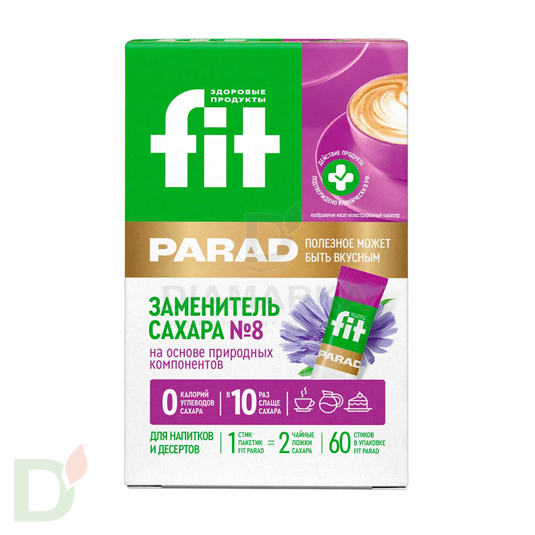 <h2>Безвредный, безуглеводный, природный подсластитель на эритрите</h2> Бесспорные плюсы заменителей сахара ФитПарад - ТОЛЬКО натуральные подсластители в составе! ФитПарад обладает нулевой калорийностью и не содержит углеводов. Он может спокойно использоваться людьми с диабетом и теми, кто соблюдает низкоуглеводную диету!<br> <h2>Термостабильный заменитель сахара</h2> Подсластитель №8 подходит для использования выпечке и других блюдах, требующих высокотемпературной обработки. Больше можно не переживать, что при термообработке ваши блюда потеряют свою сладость!<br> <h2>Не содержит углеводов, жиров и калорий</h2> <ul> <li>1 грамм ФитПарад №8 по сладости равен 5 граммам сахара.</li> <li> 1 пакетик-саше = 1 чайной ложке сахара.</li> </ul> <h2>КБЖУ подсластителя ФитПарад №8</h2> 0 - белков, жиров, углеводов, калорий.<br> <h2>Состав подсластителя ФитПарад №8</h2> эритритол - подсластитель сахароспирт, стевиозид (ребаудиозид А) - непитательный подсластитель.<br> <ul> <li>Эритритол - подсластитель сахароспирт. Многоатомный сахарный спирт, вырабатываемый из кукурузы. Один из лучших сахарозаменителей для эффективной коррекции массы тела.</li> <li> Стевиозид (ребаудиозид А) - непитательный подсластитель. Натуральный сахарозаменитель, вырабатываемый из стевии ("медовой травы"), произрастающей в Парагвае и Бразилии.</li> </ul> <b>Рекомендуемая дозировка – не более 45 г в сутки. </b><br> <br> По вкусовым свойствам этот сахарозаменитель максимально приближен к сахару!